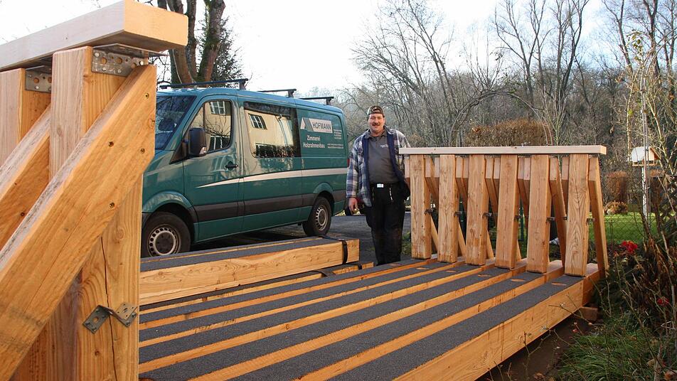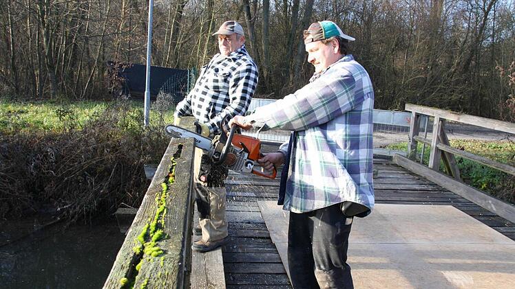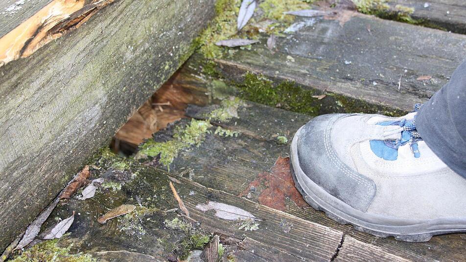 Optisch hat der Verfall durchaus seinen Reiz: Eine Mischung aus grünen Algen und grauen Flechten überzieht den Holzsteg über den Wehrkanal am Bad Kissinger Bauhof. Doch die Schönheit blendete die Experten nicht: "Die Brücke ist bei einer Routineprüfung durchgefallen", berichtet Hans-Joachim Mäutner, der bei den Bad Kissinger Stadtwerken den Geschäftsbereich Technik leitet.