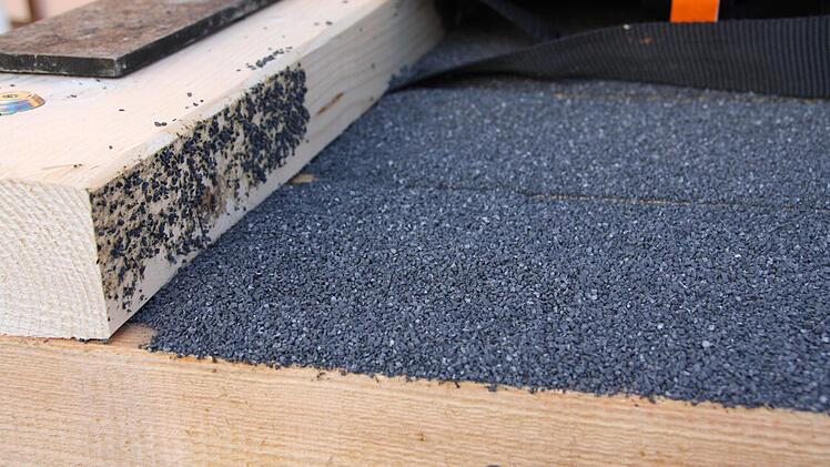 13,50 Meter lang und vier Meter breit ist die Brücke. Da die Fundamente und die Eisenträger noch in Ordnung sind, kann die Brücke abschnittsweise erneuert werden: Von hinten nach vorne wurden das Geländer abgesägt, die Lagerhölzer entfernt und die vormontierten und bereits mit Steinchen beschichteten Lärchenbalken der neuen Fahrbahn eingebaut.