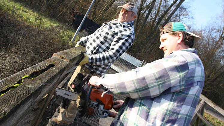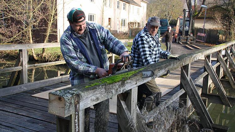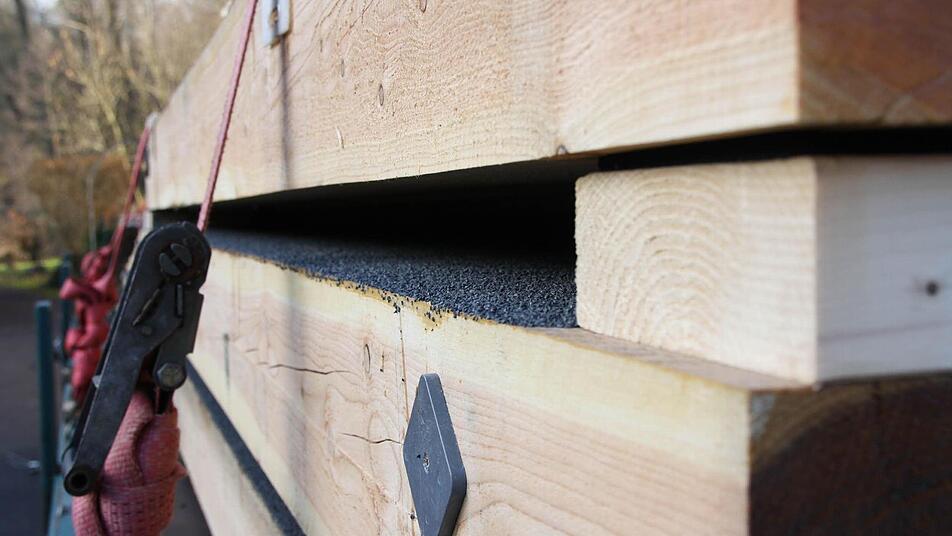 für die Sanierung ging an die Firma Hofmann-Holzbau aus Burglauer. "Die Eisenträger bleiben, aber die Holz-Fahrbahn wird komplett neu gemacht", fasst Vorarbeiter Robert Mahr die Situation zusammen. Dass die Brücke marode war, wurde gestern beim Abbauen offensichtlich: Abgemorschte Balkenköpfe, tiefe Furchen und wackelige Stützen.