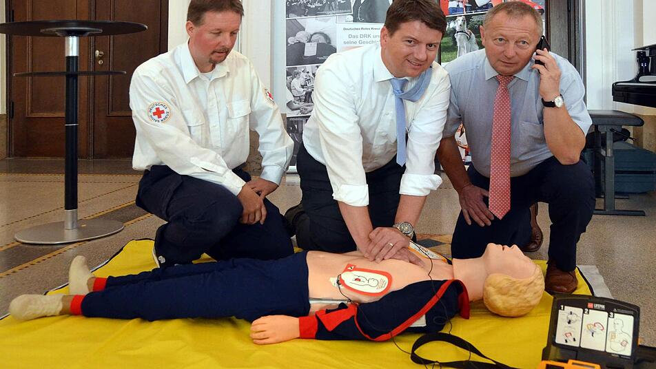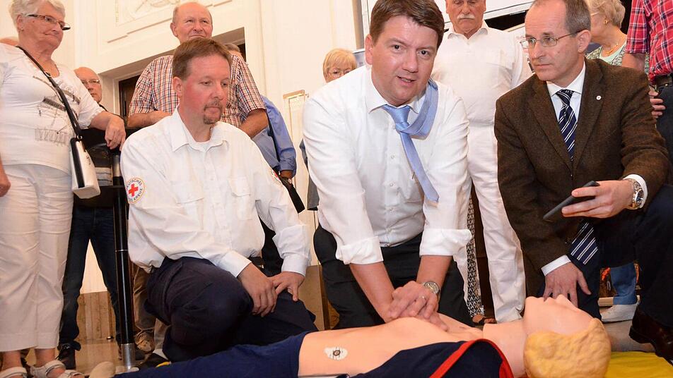 Im Voyer des Regentenbaues waren dazu mehrere Übungspuppen plaziert an denen die Erste Hilfe bei einem Herzstillstand geübt werden konnte. Wie Chefarzt Priv.-Doz. Dr.