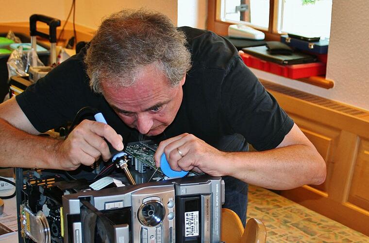 Mehr als 20 Anfragen Der Lötkolben zischt, ein kleines Rauchwölkchen kräuselt sich aus dem CD Player, den Tim Schneiker aus Nüdlingen mitgebracht hat. Interessiert schaut er dem ehrenamtlichen Experten über die Schulter, der versucht, das Gerät zu reparieren. Es ist nur eine Kleinigkeit, eine Lötstelle in der Platine war gebrochen, stellt der fest.