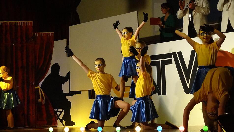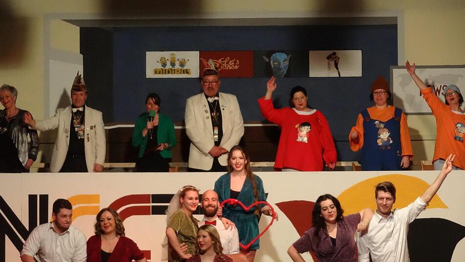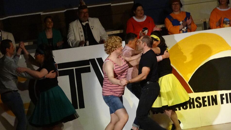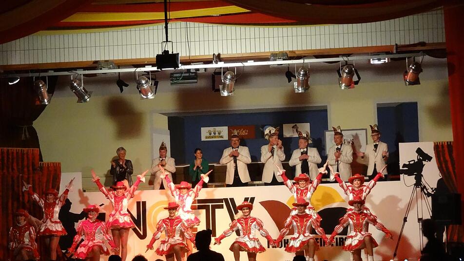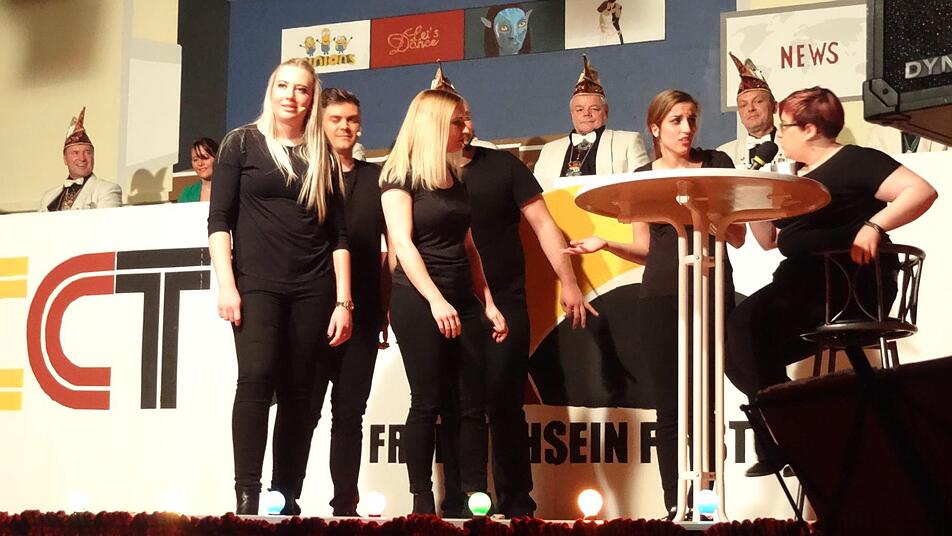 Im Anschluss strahlte NCCTV die beliebte Show "Let's Dance" aus, bei der die Juniorengarde gekonnt durch Tanzstile der verschiedenen Jahrzehnte führte, wie etwa Charleston, Bollywood-Tänzen oder auch Hip Hop, bis ihre Vorführung mit dem Titelsong des Films "Footloose" gipfelte, worauf Kevin Bacon bestimmt stolz wäre. Musikalisch ging es auch mit den folgenden Stargästen weiter: Vom fernen ZDF waren nämlich die ganz echten "Mainzelmännchen" angereist, um als Kummersänger Nachrichtensatire zu betreiben. So legten sie mit Gesang und Witz den Finger in die Wunden, etwa in Sachen fehlender ehrenamtlicher Arbeiter, aber auch der Überfall auf die Bäckerei in Nüdlingen wurde einmal thematisiert, passenderweise umgedichtet auf den EAV-Klassiker "Banküberfall", der hier zum "Backüberfall" mutierte.