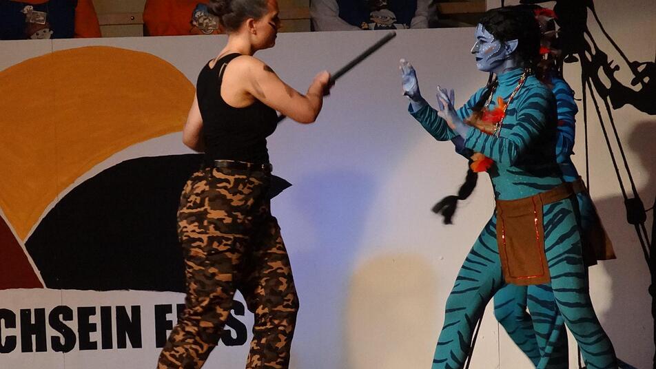 Im Anschluss wieder Musikprogramm: Die Hofheim-Garde tanzte einen Liebesfilm, komplett von anfänglicher Einsamkeit bis hin zum Happy End mit Hochzeit. Nach einem Zwischenspiel von Reporter Stefan Lang versuchte sich Nachwuchsmoderatorin Patricia Hein, die einen "Sendeausfall" mit Schwänken aus ihrer Schulzeit überspielte. Sympathisch führte sie die Zuschauer zurück in ihre Schulzeit, wie sie die meisten wohl noch in Erinnerung haben, mit dem ewigen frechen Streit zwischen Schülern und Lehrkräften. Nach überstandener "Panne" kam die Marschtanzgarde wieder zum Zug, mit ihrer Aufbereitung des Spezialeffektefeuerwerks "Avatar" von James Cameron. In der Vorberichterstattung ließ sich kaum erahnen, was die Damen hier ablieferten, denn sie führten gekonnt, verständlich und vor allem beeindruckend durch die Handlung des Films, wodurch man sich als Zuschauer fragt, ob man nicht anstatt der teuren Kinokarte damals nicht direkt diesen Tanz hätte sehen können. Wer weiß, vielleicht erwartet uns ja wie beim filmischen Original noch eine Fortsetzung? Auf jeden Fall handelte es sich hier um eines der vielen Highlights des Abends.