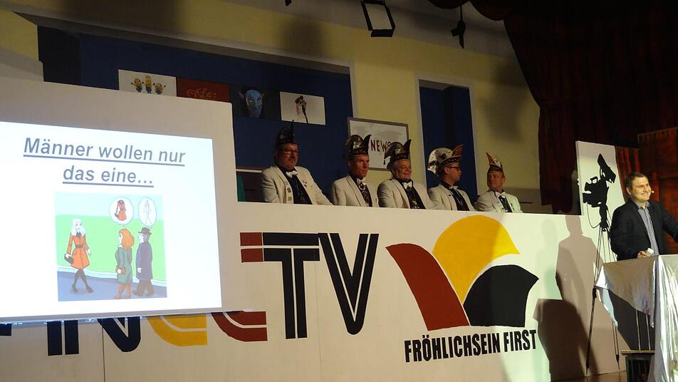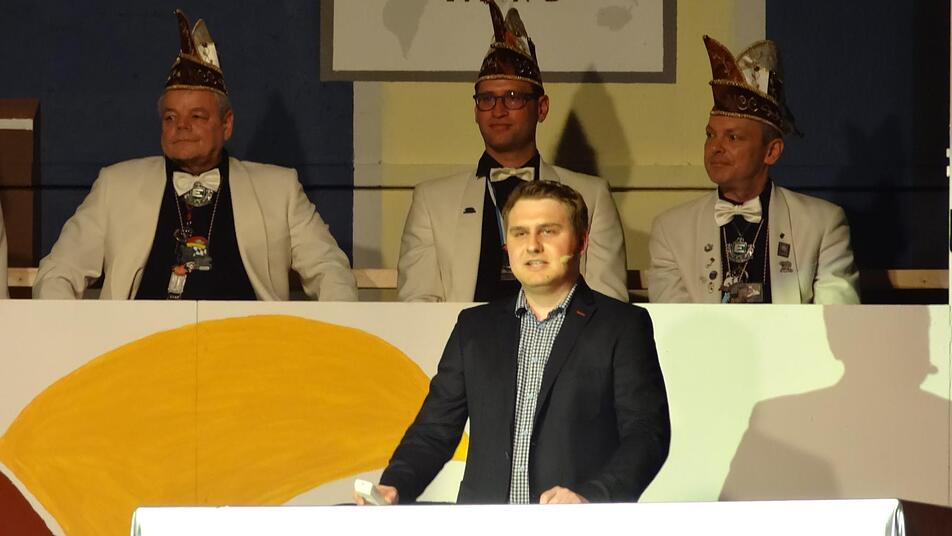 Im Anschluss kamen der Zweite Bürgermeister von Nüdlingen, Edgar Thomas, Bezirksrat Stefan Funk sowie der Ehrensenator Eugen Albert zu Wort. Damit bewiesen sie gleich zu Beginn ihren eigenen Humor: So scherzte Bürgermeister Thomas, dass man jetzt im "Trumpschen Stil" eine Mauer zwischen Nüdlingen und Haard errichten wolle, Funk witzelte, dass er einem Sender wie NCCTV natürlich sehr viel lieber seine GEZ-Gebühren bezahlte als normalerweise. Und Eugen Albert, der eigentlich aus Münnerstadt stammt, reminiszierte über seine Anfänge als Ehrensenator, und dass er ja eigentlich einmal als Faschingsmuffel zu diesen Veranstaltungen gestoßen war.