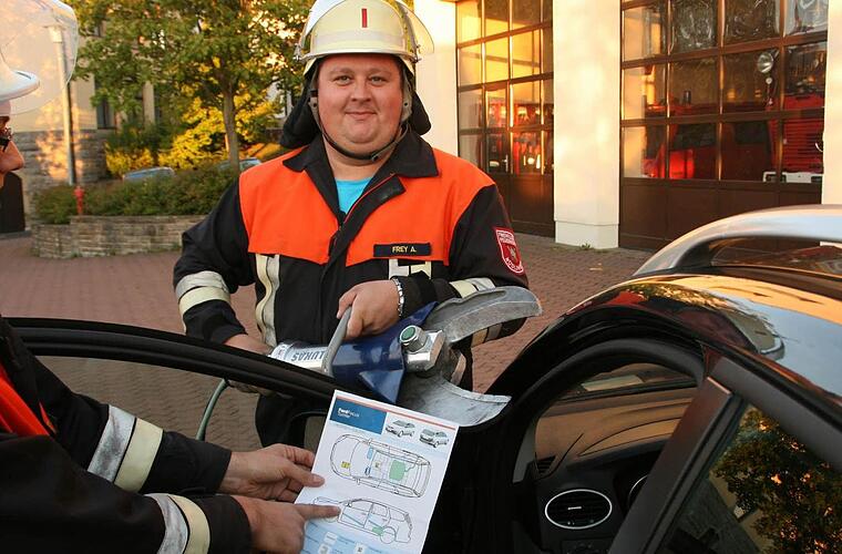 "Wenn man mit der Rettungsschere auf eine Karosserieverstärkung trifft, kann man die Schere sogar kaputt machen", sagt Florian Wilm. Die Rettungskarte für Autos, so Kreisbrandrat (KBR) Benno Metz, ist "eine sehr nützliche Sache". Auch die Kreisbrandinspektion habe sich schon Gedanken darüber gemacht, mit einer Aktion verstärkt auf diese Informationsquelle für Rettungskräfte hinzuweisen. "Mit dieser Karte bekommen wir Infos, die wir sonst nicht haben", so der Kreisbrandrat, "da wissen wir gleich, wo ein Airbag ist und schneiden da nicht rein".