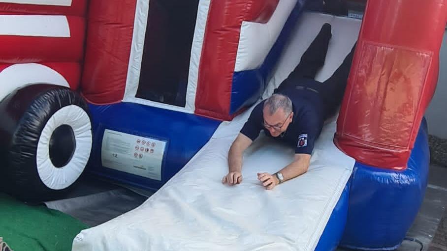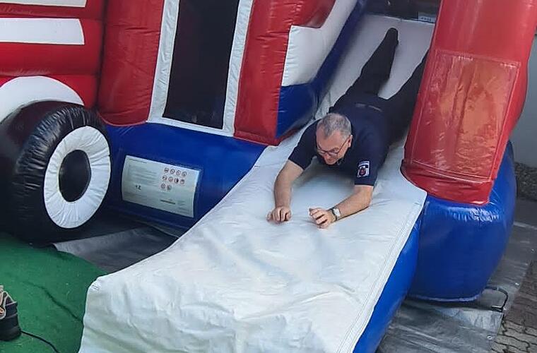 Die Kinder staunten nicht schlecht, als sie das viermal zwei Meter große Lego-Feuerwehr-Land sahen, das einer aus der Feuerwehr zu Hause hobbymäßig zusammenbaute. Dort war die Spielzeug-Feuerwehr gleich mehrfach im Einsatz und es gab unter anderem Windräder, Schiffe und Kräne zu sehen. Aber auch die Erlebnis-Hüpfburg, die vom Feuerwehrstandort Halle angefordert worden war, sorgte bei den Mädchen und Buben für großes Aufsehen, erzählt der Stadtbrandinspektor.