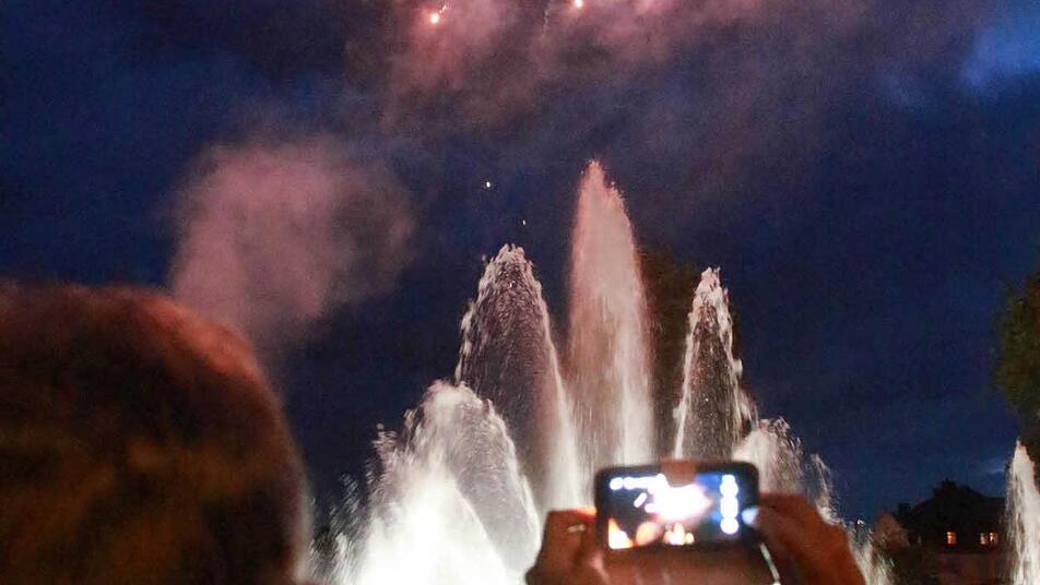 "Anfangen! Anfangen!", die Meute wurde ungeduldig. Einige der Schaulustigen hatten sich schon um 20.30 Uhr auf der Ludwigsbrücke platziert, um die "deutschlandweit einmalige" Show, wie groß angekündigt, mitzuerleben. Nach der "Rosengala" des Kissinger Sommers um 21.15 Uhr sollte es losgehen. Sollte. Dass die Veranstalter warten wollten, bis es dunkel genug für die Lichter-Show ist, hatten sie den Wartenden nicht verkündet. Oberbürgermeister Kay Blankenburg deutete bei der offiziellen Einweihung am Nachmittag zwar an, dass die Fontänen-Vorführung der neuen Brunnenanlage mit Einbruch der Dunkelheit zwischen 22 und 22.30 Uhr starten werde, doch die meisten Zuschauer richteten sich wohl nach der offiziellen Einladung und erwarteten um Punkt 21.15 Uhr die große Show.