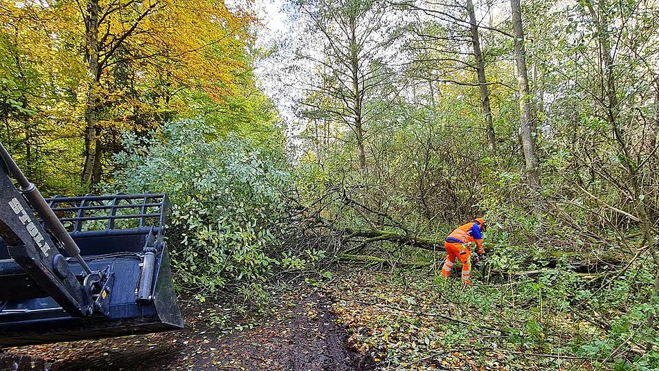 Die Entscheidung scheint richtig gewesen zu sein. Denn auf dem Weg per Shuttle-Bus nach oben zum eigentlichen Messegelände musste die Feuerwehr den Weg von mindestens drei umgestürzten Bäumen befreien. Als sich gegen Mittag der Wind legte, kontrollierte Stadtbrandinspektor Harald Albert mit einigen Feuerwehrmännern und städtischen Mitarbeitern den Wald - und musste weitere Bäume fällen, die in Straßennähe in gefährliche Schieflage geraten waren.