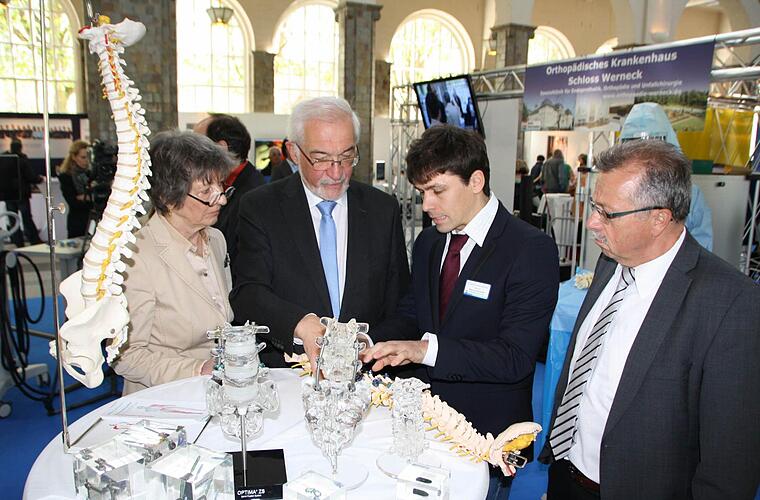 Der Neurochirurg stellt mikroskopische und minimal-invasive Operationsmethoden an der Halswirbelsäule vor. Ein Alleinstellungsmerkmal in der Region sei die operative Schmerztherapie. "Viele Patienten sitzen daheim, haben chronische Schmerzen und wissen gar nicht, welche Möglichkeiten es gibt", sagt Amann. Genau das wollen er und seine Kollegen mit ihrem Stand ändern.