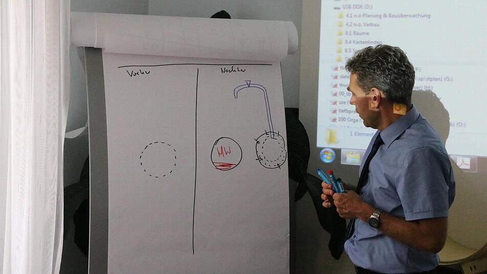 In der vergangenen Woche startete die Zusammenarbeit mit dem Ingenieurbüro Schüßler-Plan. Mitarbeiter Jirka Skrbek begleitete die Studenten, um sich selbst zu informieren. Unter anderem stieg auch er in den Schacht vor dem Neuen Rathaus, in dem das Grundwasser aus der Umgebung reguliert wird. "Die einzelnen Probleme kennen wir, hier kommt halt alles zusammen", fasst er die Aufgabe zusammen. Auch für Student Werner Buchert war die Exkursion nach Bad Kissingen sehr interessant. In Wiesbaden habe sich die Gruppe zwar den Bau eines Parkhauses im Heilquellenschutzgebiet informiert, aber die Sanierung einer Kanalisation sei deutlich schwieriger.