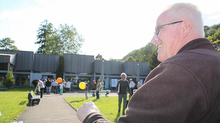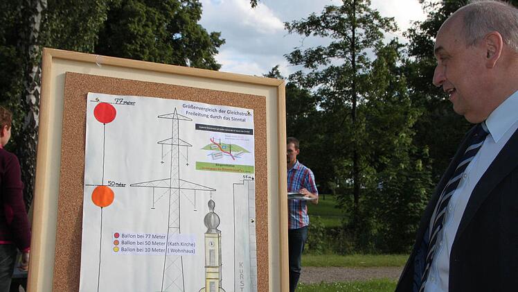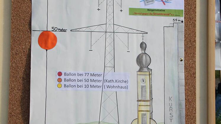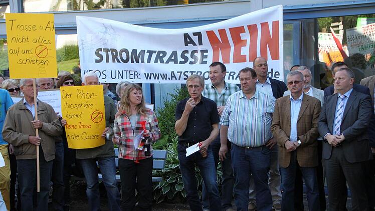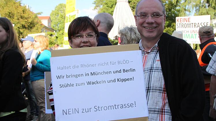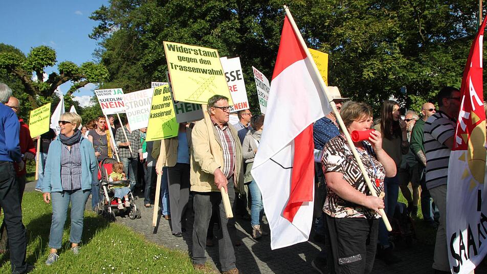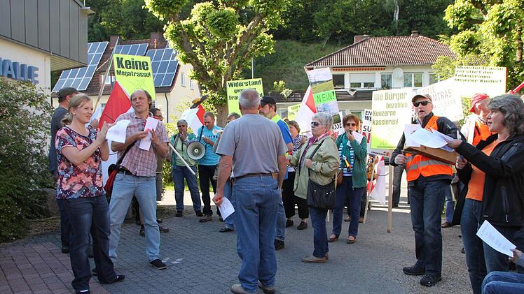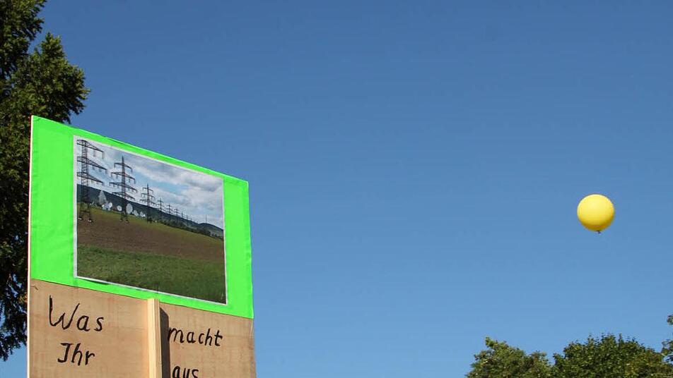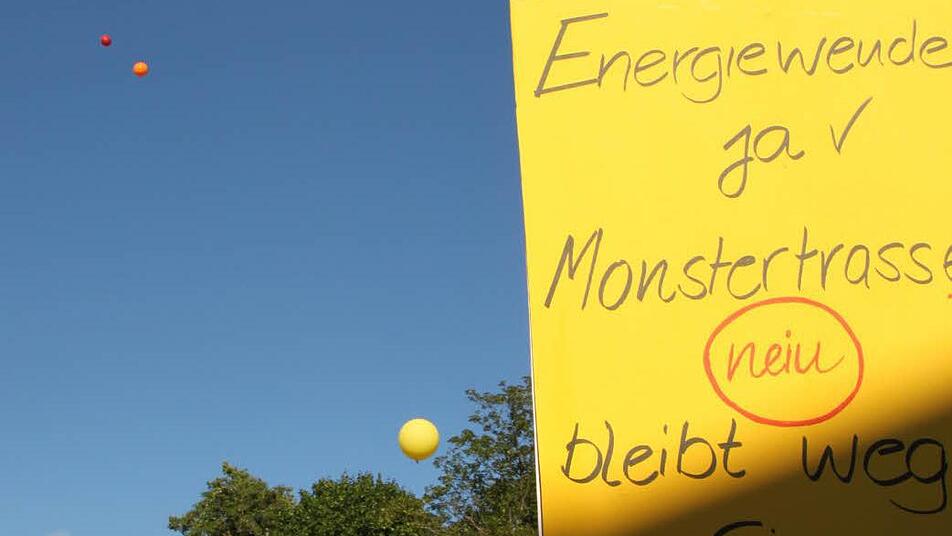 Friedrich Schumm spannt die Leine. An deren Ende schwebt ein Ballon. 50 Meter ist die Schnur lang. Die Masten von "SuedLink" sind höher. "Wir haben schon den Dreck von der Autobahn, wir brauchen nicht noch den Dreck von SuedLink", ruft Ingo Queck, Vorsitzender der Bürgerinitiative "Sinntal gegen die Stromtrasse". Die Menge tobt. Mehr als 250 Menschen machen ihrem Unmut vor der Georgi-Halle Luft. Die Bürgerinitiativen aus Schondra, Elfershausen und Wasserlosen haben sich dem Protest der Brückenauer angeschlossen und sich mit Schildern und Trillerpfeifen bewaffnet.