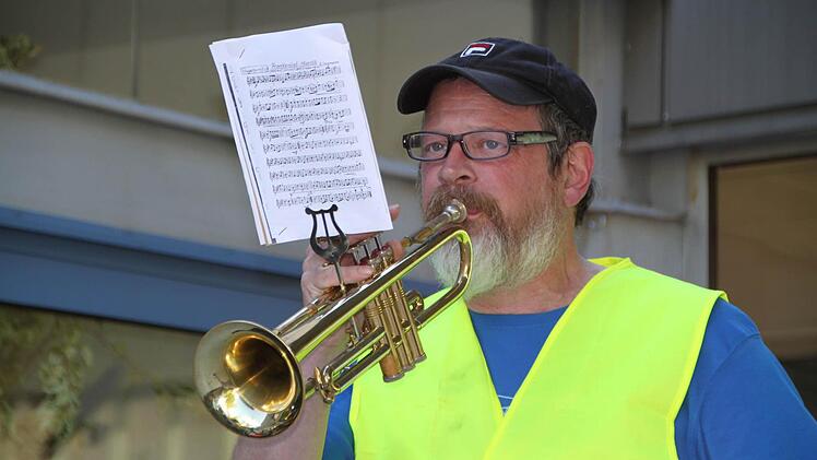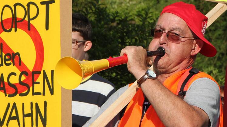 Die Emotionen sind mit Händen zu greifen. "Wir sind auch das Volk!", ruft ein alter Mann in Anlehnung an die Montags-Demos in Leipzig vor 25 Jahren. "Wir sind auch das Volk!", antwortet die Menge. Jürgen Pfister (PWG), der als Vertreter für Bürgermeisterin Brigitte Meyerdierks (CSU) gekommen ist, die gerade im Urlaub ist, überreicht 2000 Unterschriften gegen "SuedLink" an Tennet: "Bad Brückenau steht auf und sagt ganz klar Nein zur Trasse!" Dann greift Erwin Miller, der zusammen mit Queck die Brückenauer Initiative anführt, zur Trompete. "Gott mit uns, du Land der Franken", singen die Menschen. "Er bewahre unsren Kindern ihre Heimat unversehrt und verhindre für die Zukunft, dass der Wahnsinn wiederkehrt!" Pfeifen, Klappern, Trillerpfeifen.
