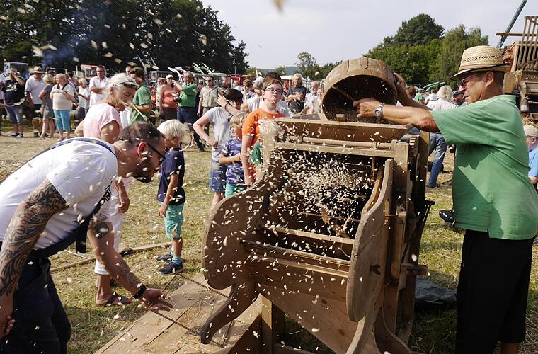 Zurück am Festplatz stehen zahlreiche interessante Vorführungen auf de Programm. Um 14 Uhr wird die Getreideernte mit einem Fahr Getreidebinder den Besuchern präsentiert. Gelebte Geschichte erleben die Gäste um 15 Uhr, wenn die Dreschsirene aus dem Maschinenwagen von 1934 den Beginn einer Dreschvorführung aus Zeiten von anno dazumal ankündigt. Das Dreschen mit dem Dreschflegel beginnt um 16 Uhr und wird von der Dreschgruppe der Dreschgemeinschaft Stadtlauringen anschaulich demonstriert.