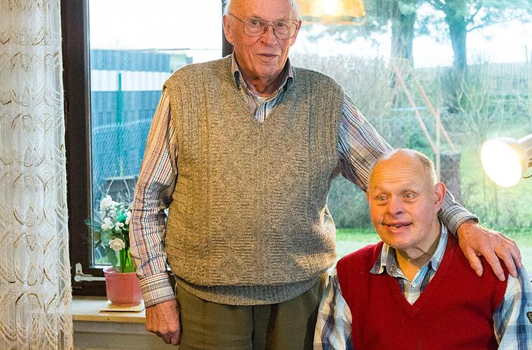 Eine lebenslange Aufgabe: Andreas Engert betreut seit fünf Jahrzehnten seinen behinderten Sohn Joachim. Dafür erhielt der 92-Jährige das Ehrenzeichen des bayerischen Ministerpräsidenten. Fotos: Anand Anders