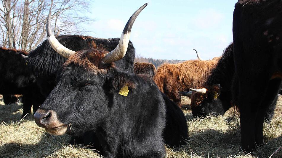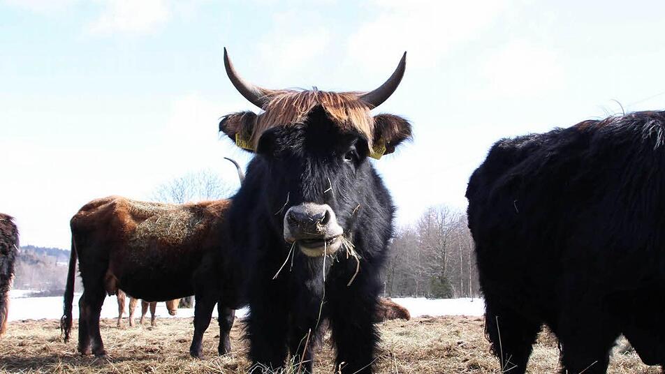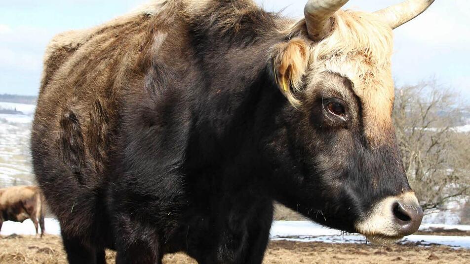 Novi schließt die Augen. Es sind ein paar Grad über Null. Seine Wohlfühltemperatur. Das schwarze Fell saugt die Sonnenstrahlen auf, die alle so sehnsüchtig erwartet hatten. Nur ein paar Wolken unterbrechen den Frühling in der Hochrhön an diesem Vormittag. Carmen Kronester versenkt ihre Finger in den dicken Haaren und krault Novi zwischen den Ohren. Der hält inne. Eine Tonne Kuschelgewicht bringt der Auerochsenbulle auf die Waage.