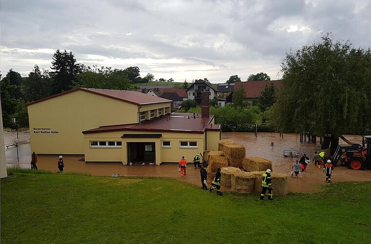 Weitgehend vor Schäden bewahrt werden konnte dagegen die Bürgermeister Karl Keßler-Halle. Dort errichteten Landwirte, Feuerwehrleute und Bauhof-Mitarbeiter einen Wall aus Strohballen und Sandsäcken, um die Wassermassen vorbeizuleiten. "Die Bevölkerung hat toll mitgemacht", lobt Kreisbrandinspektor Thomas Eyrich das Zusammenwirken. Ohne die Unterstützung von Traktoren hätte man viel weniger ausrichten können. "Schon die Anfahrt nach Dittlofsroda war schwierig", beschreibt Eyrich das spektakuläre Geschehen. Aus Richtung Wartmannsroth war die Ortseinfahrt derart überflutet, dass man nur an der Schule vorbei in den Ort kam. In Mitleidenschaft gezogen wurden auch mehrere Privatanwesen, bei denen Keller voll liefen sowie das Feuerwehrgerätehaus und das Haus der Bäuerin. Nachdem ein Trafohäuschen gut einen Meter unter Wasser gestanden war, wurde sicherheitshalber der Stromversorger verständigt.