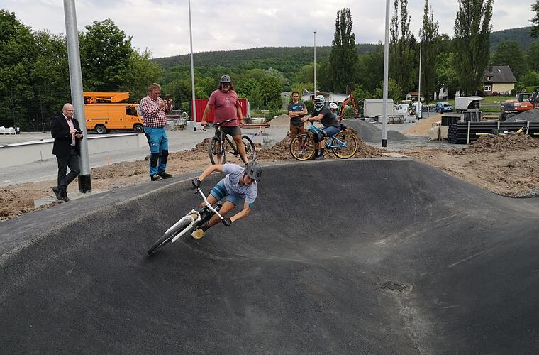 Der große Pumptrack und der kleine Übungspumptrack auf der Bischofsheim Rollsportanlage sind fertig gestellt, zumindest die die Asphaltierungen sind vorgenommen. Keine zwei Stunden nachdem der Belang zu betreten war, flitzten die Jungs der Firma pumptrack.de über die Fläche.  Bürgermeister Georg Seiffert, Bauamtsleiter Andreas Erb und dritter Bürgermeister Manfred Markert sowie Siegfried Neumann, der bei der Planung der Rollsportanlage mitwirkte, waren zur ersten Probefahrt gekommen. Im Pumptrack wird die Geschwindigkeit durch Gewichtsverlagerung und gezielte Zieh- und Drückbewegungen aufgebaut. So kann der Kurs ohne Pedalumdrehung durchfahren werden. Die Räder  haben einen niedrigen Rahmen, der Sattel sitzt ganz unten, damit sie nach oben Platz für diese spezielle Fahrtechnik haben. Gänge sind bei diesen Fahrrädern nicht nötig, und sie haben auch nur eine Bremse. Die vordere Federgabel ist ein wichtiger Bestandteil.