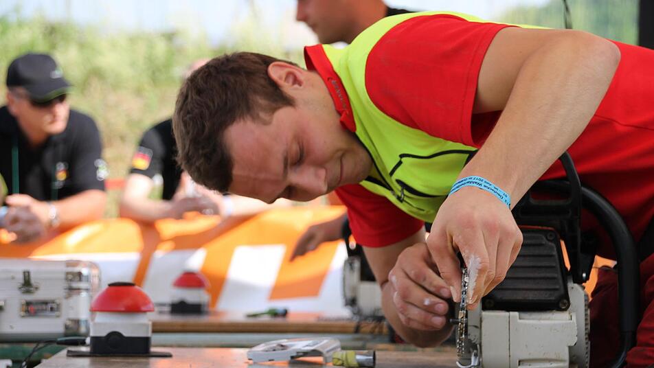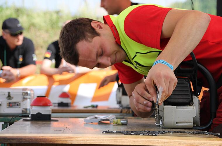 Für Julian Schwender stehen nach der Fällaktion noch der Parcours mit Kettenwechsel auf Zeit an, Präzisionsschnitt und Kombinationsschnitt mit einem Schnitt von unten und einem von oben, die sich im schräg gestellten Stamm genau treffen müssen, und am Ende die Entastung eines Stammes, in dem Besenstiel artige Prügel stecken. Insgesamt 23 Konkurrenten hat Schwender in seiner Altersklasse bis 24.