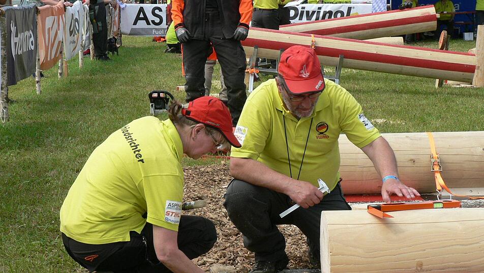 Schwender ist eine von auffällig vielen Frauen unter den Schiedsrichtern in der Männerdomäne. Und sie, Mann Gottl und Sohn Julian, die beide selbst die Motorsägen kreischen lassen, sind natürlich der Grund, warum die Deutsche Meisterschaft nach 2003 zum zweiten Mal im kleinen Gräfendorf stattfindet. Sandra Schwender kam, wie andere Schiedsrichterinnen auch, über ihren Mann dazu, der seit 20 Jahren an Wettbewerben mitmacht. Irgendwann wurde sie angesprochen: "Wenn du immer dabei bist, kannst du auch mal Protokoll schreiben". So fing es an. 2006 wurde sie Mitglied in der Bundesregelkommission, 2010 sogar Vorsitzende, und seit 2014 ist sie gewähltes Mitglied im Weltverband der Waldarbeitermeisterschaften.