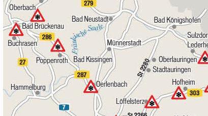 Schweinfurt: B286 (Hahnenhügelbrücke), St2272 (Gerolzhofen in Richtung Wiebelsberg), St2274 (Michelau-Sudrach in Richtung Geusfeld), St2266 (Löffelsterz), St2280 (Oberlauringen).