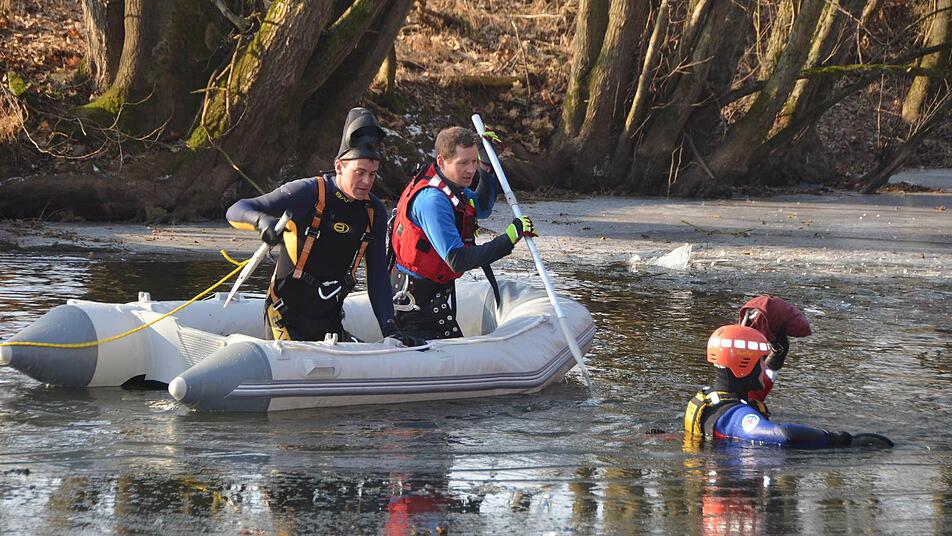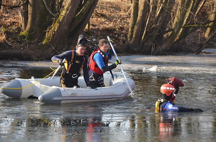 So ergaben sich drei Szenarien, die alle zu berücksichtigen waren: entweder eine Falschmeldung, oder der Mann ist eingebrochen und wieder herausgeklettert, oder er ist noch unter dem Eis. Für die 85 Einsatzkräfte einschließlich zweier Hubschraubern der Polizei und der Johanniter mit Wärmebildkameras eine höchst komplexe Aufgabe. Denn die Strömungsretter und Taucher mussten mit Äxten und Motorsägen Löcher in das etwa fünf Zentimeter dicke Eis schlagen - um dann auch nicht allzu viel zu sehen. Die Taucher, die ins Wasser stiegen, kamen nur schwer vorwärts, weil zwischen Flussgrund und Eisdecke nur wenig Platz war. Immerhin war es im Wasser wärmer als an der Luft. Nicht zuletzt deshalb hatten Mitarbeiter des Roten Kreuzes ein beheizbares Zelt aufgebaut, in dem sich die Rettungskräfte aufwärmen konnten.
