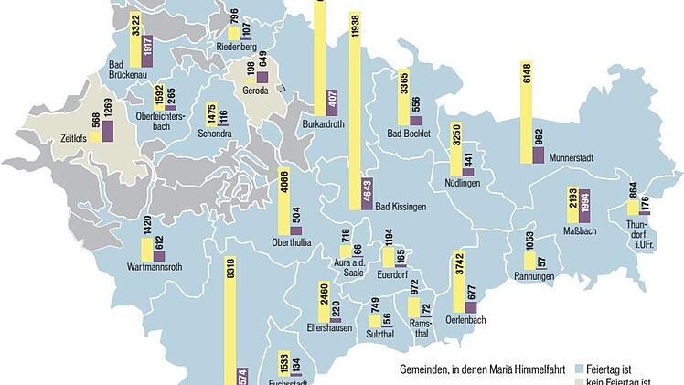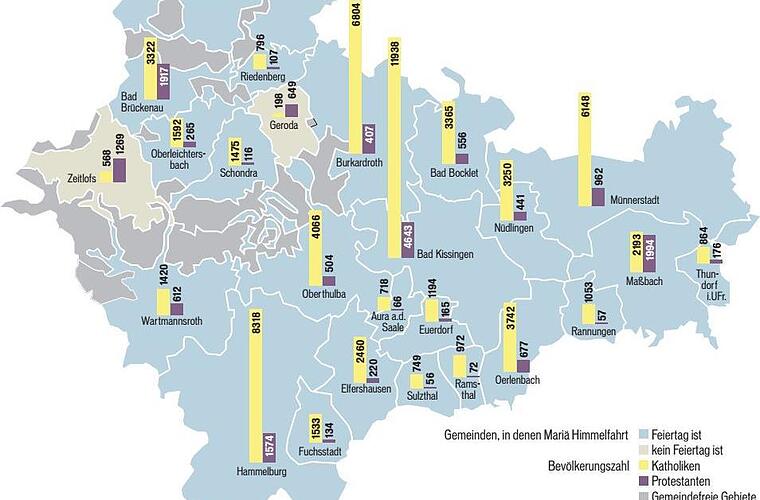Bad Kissingen sind nur noch in zwei kleinen Gemeinden die Protestanten in der Überzahl: Geroda und Zeitlofs. In Maßbach hat sich das Verhältnis beim Zensus 2011 umgekehrt, deshalb ist dort seit dem Jahr 2014 der 15. August ein Feiertag. Die wenigen Geschäfte, die bis dahin an Mariä Himmelfahrt noch auf hatten, müssen nun zu bleiben.