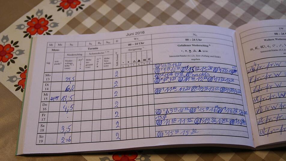 Die Daten trägt die rüstige Frau täglich fein säuberlich in ihr Notizbuch ein. Was sich für Außenstehende wie Hieroglyphen liest, sind spezielle Zeichen für die Wetterverhältnisse. "Die Abkürzungen hat man nach den vielen Jahren schon im Kopf", erklärt sie.