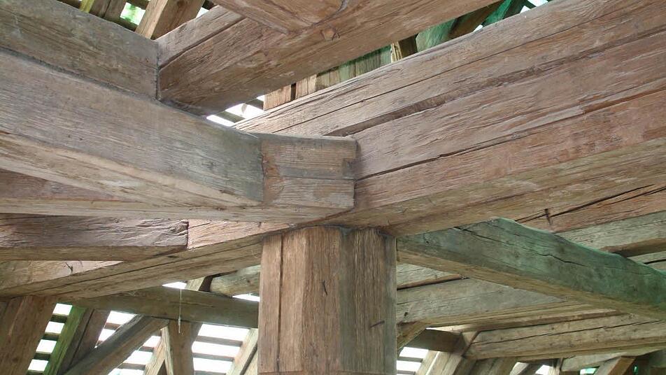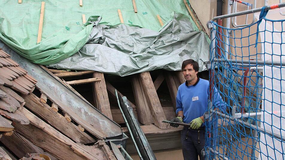 Wo es gar nicht anders geht, muss allerdings auch neues Material eingebaut werden, vor allem an den Knotenpunkten und Ecken der Gesimse. "Das wird alles mit dem Handhobel herausgearbeitet", berichtet Zimmerer Marko Fischer von der Bad Kissinger Firma "Grund und Kraus", die auf die Sanierung alter Gebäude spezialisiert ist. "Für manche Profile werden sogar extra die Hobel gefertigt", berichtet er. Und dann ist jede Mange Muskelkraft gefragt: Bis zu zwei Stunden dauere es, einen laufenden Meter Gesims nach dem historischen Vorbild aus den Eichenbalken herauszuarbeiten.