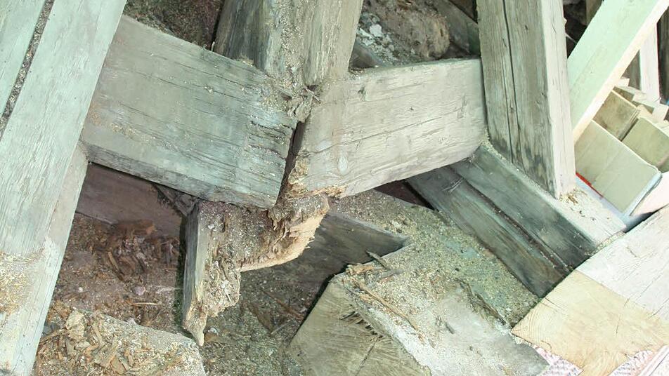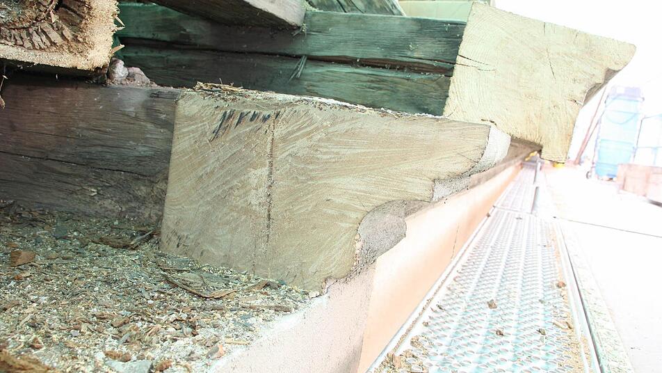 Begutachtung vom Gerüst aus Mit dem Fernglas hatte Kiesel die insgesamt 200 laufenden Meter Gesims unterm Dach der Jakobuskirche begutachtet. "Das Holz sieht von außen sehr gut aus", verweist er auch an dem schadhaften Balken auf die äußeren drei bis vier Zentimeter. Dahinter kommt dann aber der "Schnupftabak", also morsches Holz. "Da ist jahrzehntelang das Wasser reingelaufen", nennt Kiesel als Ursache. Schließlich seien die Balken mindestens 239 Jahre alt (siehe Info-Kasten zur Geschichte).