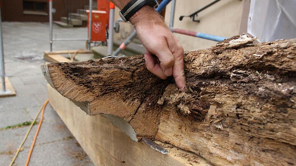 Mit dem bloßen Finger bohrt Architekt Henry Kiesel ein Loch in den Eichenbalken am Gesims der Jakobuskirche. "Das ist nur noch Schnupftabak", sagt er und lacht - aber nur kurz: "Das muss natürlich alles ausgetauscht werden", schiebt er hinterher und seine Miene wird gleich wieder ernst. "Ein Teil der Schadensbilder war unerwartet", fasst Kiesel die Bestandsaufnahme an der Jakobuskirche zusammen.