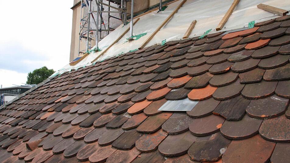 Insgesamt soll möglichst viel erhalten bleiben: Intakte Gesimsstücke werden wieder eingebaut, gute Ziegel sollen auf einem der 28 Dachflächen zusammengefasst werden und Übergänge werden nach historischem Vorbild gestaltet: Sämtliche Ortgänge sind nicht mit Ton-Ziegeln, sondern mit Schieferplatten abgedichtet. Kiesel überlegt noch, wie die Ortgänge trotz Schiefer-Eindeckung dicht zu bekommen sind.