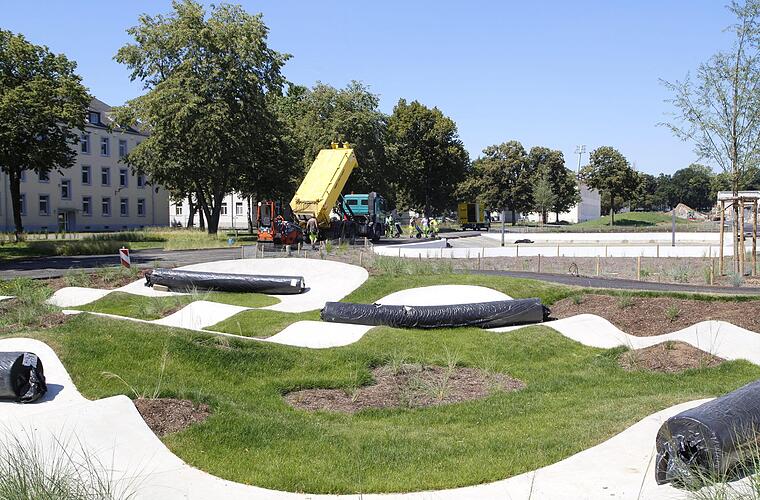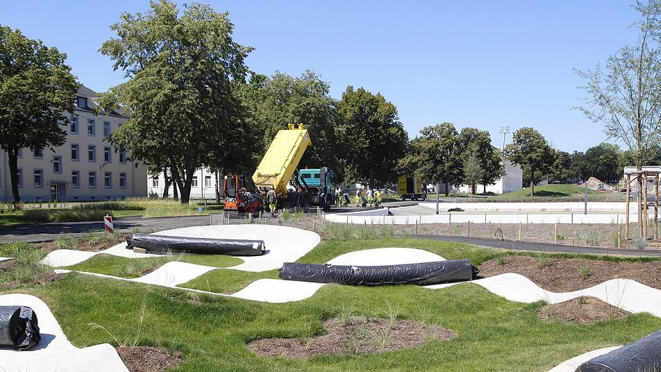 Neu gestaltet ist auch der Vorplatz vor der Fachhochschule, der schon Teil der Nord-Süd-Verbindung ist, die die Stadt plant, wenn alle FH-Gebäude, unter anderem für den neuen Robotik-Studiengang, fertig sind. Erst mal nur geschottert wird der Platz zwischen Niederwerrner Straße und FH, denn der Freistaat hat dieses Gelände noch nicht begonnen zu planen. Oliver Schikora