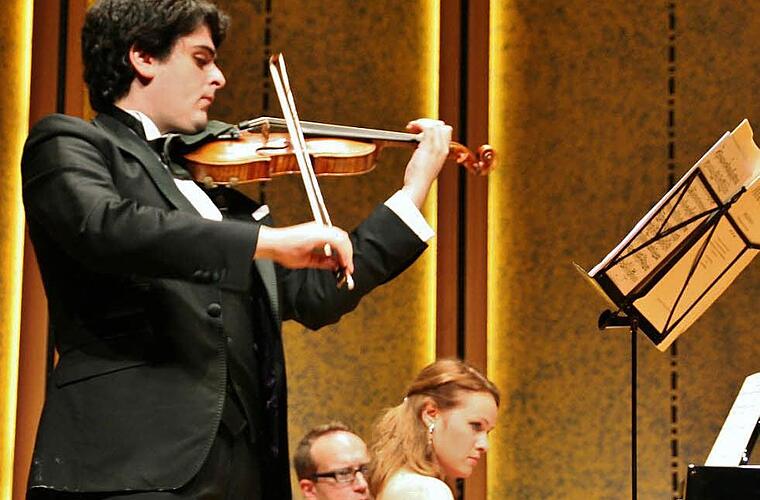 So richtig befreit und mit großem Spaß an der Intonation wirkte der Geiger allerdings dann bei Debussys g-moll-Sonate. Da löste sich die Spannung, da vermochte er die überraschenden Themen und Tempowechsel der Musik der frühen Moderne überzeugend zu gestalten, da wurden die Triolen zu verspielten Kapriolen, da fand auch seine Begleiterin die stimmige Lösung des Balanceproblems zwischen Violine und Klavier. Überaus sympathisch, wie Natalia Pegarkova ihrem Mann mit Augenaufschlag die Einsätze vorgab. Da flog nicht nur musikalische Harmonie hin und her.