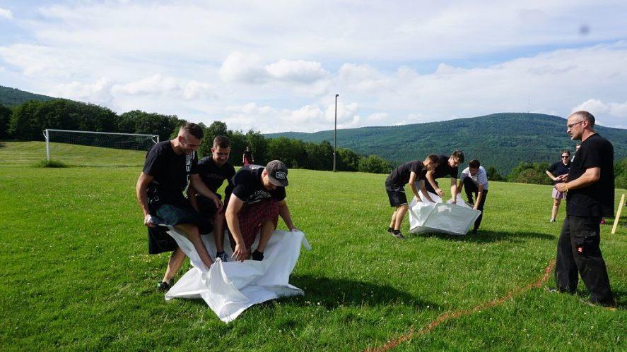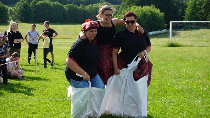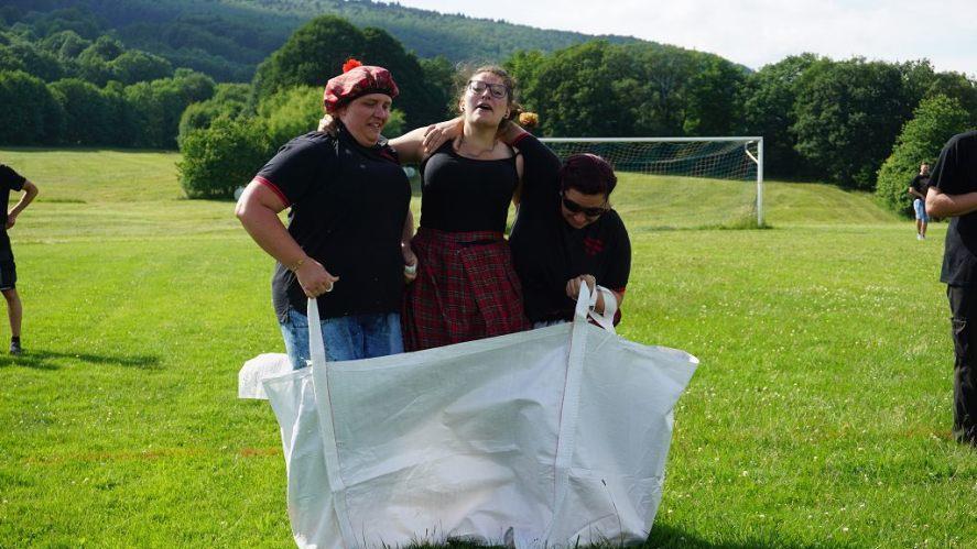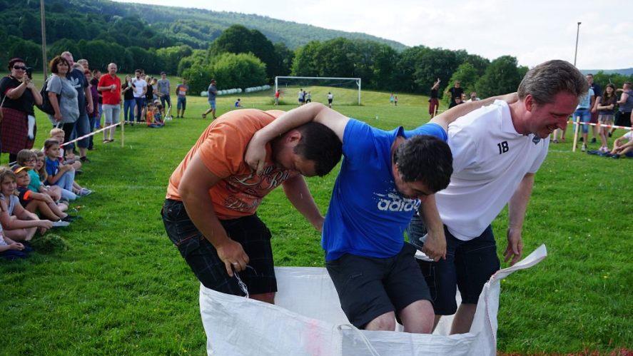 Weit werfen war noch relativ einfach. Aber richtig schwierig war die neue Disziplin: Sackhüpfen, und zwar zu dritt.