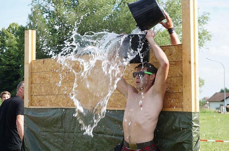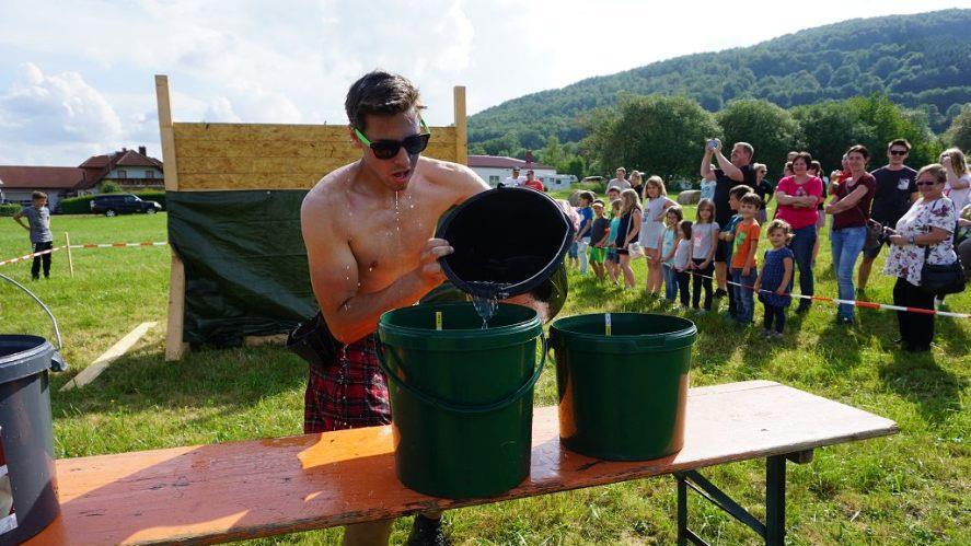 Nach soviel werfen, hüpfen und rollen hatten die Highlander dringend eine Abkühlung notwendig. Es wurde Zeit für "Maitsch- Schöpfe" (Wasserschöpfen). Durch eine Holzwand getrennt, standen zwei Teamkollegen Rücken an Rücken, während der dritte einen Eimer mit Wasser befüllte. Das Wasser musst über die Wand von einem Eimer in den nächsten befördert werden. Ein nasses Vergnügen. Schnell zeigte sich, dass hier Ruhe und kurze Zurufe die Sache durchaus erleichterten und weniger Wasser daneben ging. Doch nass wurden sie alle, daran kam kein Teilnehmer vorbei.