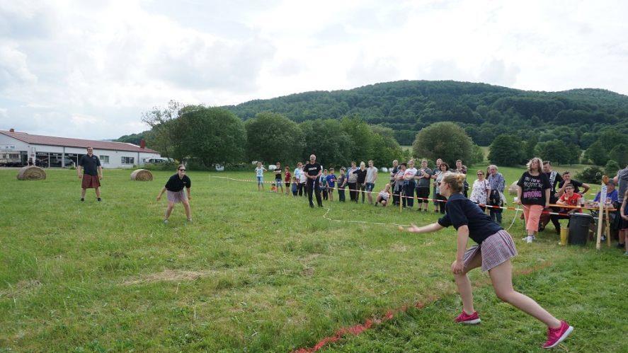 Beim Eierweitwurf ging es nicht nur darum ein Ei soweit wie möglich zu werfen, es musste vom Partner auch - ohne dass es beschädigt wurde - gefangen werden. Keine leichte Aufgabe, denn letztlich zählte natürlich schon auch die Weite. Den weiteste Wurf mit 23 Metern erzielte Thorsten Kapperer, der einige Jahre als Pastoralreferent in den Walddörfern tätig war und anlässlich der Highlandgames seiner ehemaligen Wirkungsstätte eine Besuch abstattet. Aus Lohr hatte er gleich noch Tobias Bernhard mitgebracht, der seinen Junggesellenabschied mit Freunden bei den Highlandgames feierte.