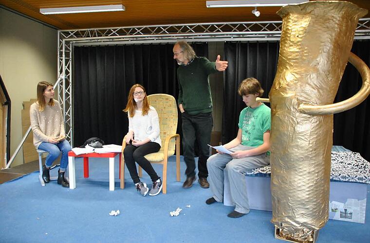 Haben die Schüler bis dahin nur in kleinen Gruppen einzelne Szenen geprobt, standen in Rieneck Ensemble-Proben auf dem Stundenplan. "Die Stimmung muss von allen 18 Schauspielern verkörpert werden. Diejenigen, die nicht viel sagen, müssen für die Stimmung sorgen", sagt Regisseur Dirk Hönerlage. Wenn die Schüler mal einen Hänger haben, springt Souffleuse Kerstin Fell ein. Die Schülerin aus der Q12 gehört eigentlich zum Technik-Team.