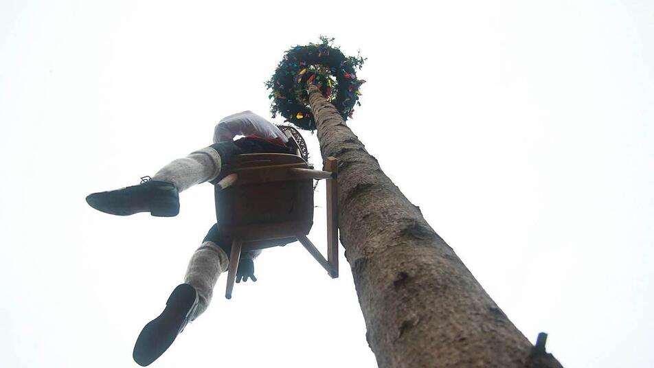 Wie es der Brauch vorschreibt, gibt es bei der Detterer Kirmes jedes Jahr einen Baum, um den die Paare tanzen. Der wird mit Pferden aus dem Wald geholt und samstags aufgestellt. Während die Männer den Baum auf dem Platz unter der Kirche aufrichten, spielen Musiker. Geschmückt ist der Baum mit einem Kranz, der in der Woche vor dem Fest gebunden wird. Aber Achtung: Hängt der Kranz schief am Baum, bedeutet das, dass eines der Kirmesmädchen schwanger ist. "Das hat schon mehr als einmal gestimmt", sagt Gudrun Alexander und lacht.