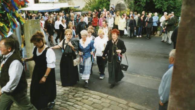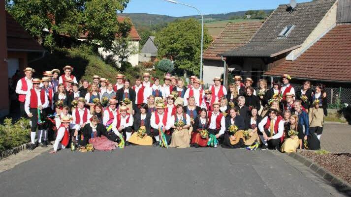 Die Zeit nutzen die Frauen, um ein Lied für den Kirmeskönig zu dichten, das sie vor dem Kirmestanz vorsingen. Mit ihren Tanzpartnern, den Sträußen, dem Kirmeswein und der Kapelle macht sich die Gesellschaft auf den Weg zum Kirmesbaum am Bürgerhaus. Immer vorneweg, der Kirmeskönig mit einem kleinen geschmückten Bäumchen in der Hand. Am König liegt es nun, das "Plomännchen" an den Baum zu hängen. Die Strohpuppe soll auf den Baum aufpassen, erklärt Anja Feuerstein aus Geroda. Sie ist Vorsitzende des Kirmesvereins. Sobald das Männchen hängt, ist es Zeit zu tanzen.