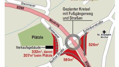 Während der Sitzung des Bauausschusses hatte die Verwaltung den erhöhten Flächenverbrauch für einen Kreisel durchaus angesprochen: Für eine Erneuerung der Kreuzung würden rund 16,5 Quadratmeter Privat- und 53 Quadratmeter städtische Fläche benötigt. Bei einem Kreisel wären es 683 Quadratmeter private und 755 Quadratmeter städtische Fläche (siehe Grafik). Nach dem vorläufigen Plan des Staatlichen Bauamtes würde die