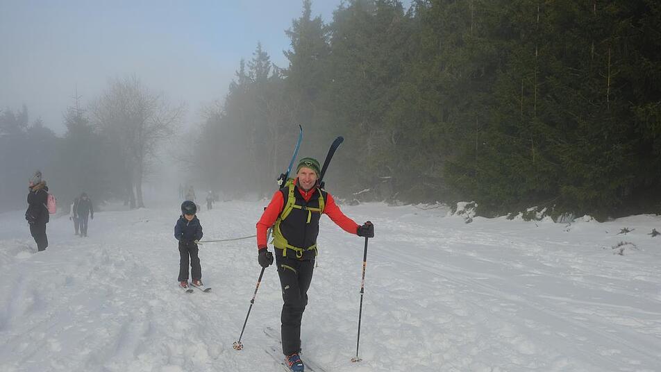 Dorthin lockte es wahre Massen von Winterwanderern. Auch Holger Gegner aus Gerolzhofen, der mit Tourenskiern Richtung Gipfel zog, im Schlepptau den Sohnemann. "Das ist das dritte Mal in dieser Woche in der Rhön. Es ist traumhaft", schwärmt der Gerolzhöfer, der vor ein paar Tagen auch im Fichtelgebirge einen Traum-Wintertag genossen hatte. Mit Schlitten, Schneeschuhen oder ganz gewöhnlich zu Fuß auf dem Winterwanderweg zog ein regelrechter Pilgerstrom am Samstag gen Kreuzberg.