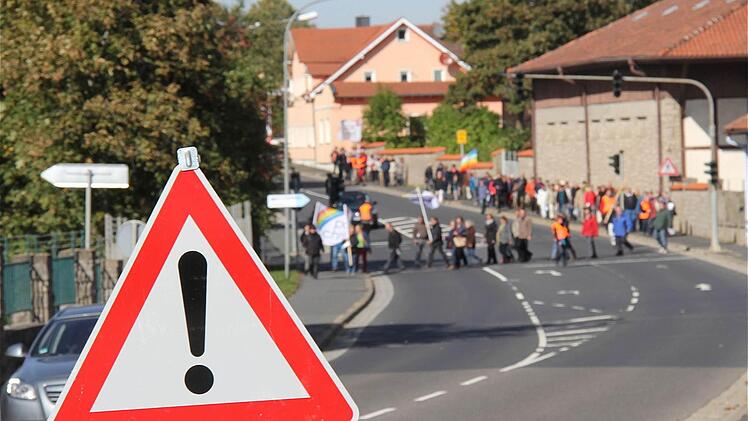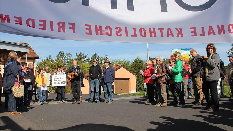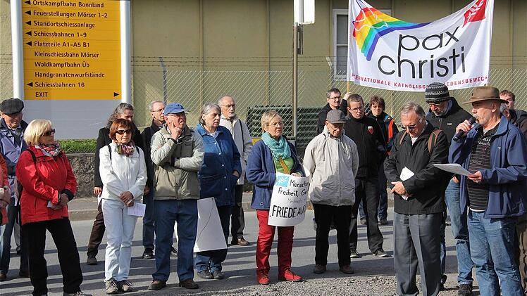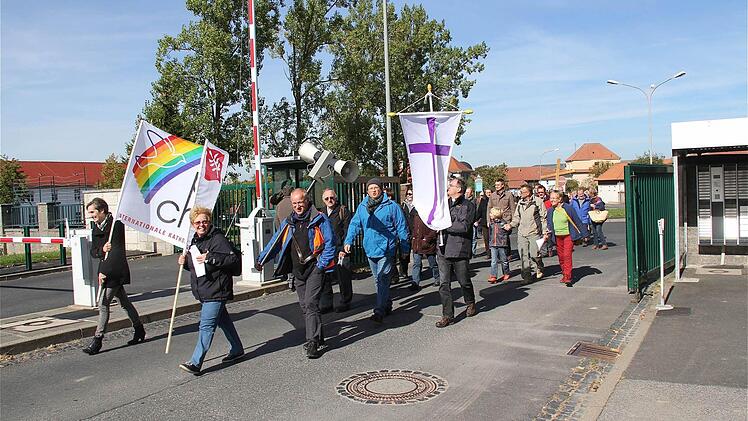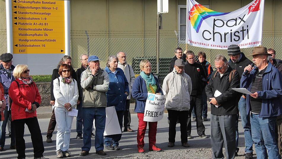 Prozessionszug in Richtung Saaleck-Kaserne. Dort ging für die Friedensbittenden die Schranke hoch, und der Weg über das Kasernengelände war frei. Die Historie des Kasernengeländes erläuterte Oberstleutnant a. D. Andreas Wacker, der dem katholischen Pfarrgemeinderat angehört. "Wacht auf - wir sind verwickelt" und "Von der Gewaltlogik zur Konflikt-Prävention" waren weitere Stationen auf dem Kasernengelände überschrieben.