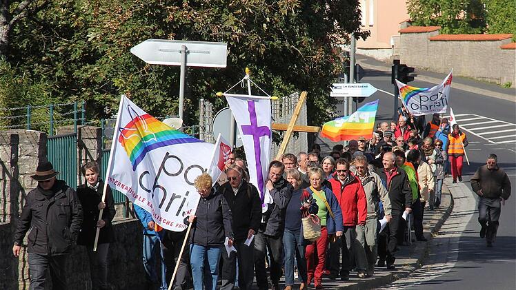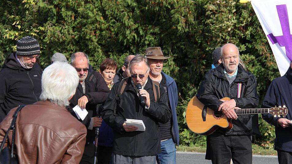Friedensweg auf Einladung der Bistumsstelle "Pax Christi". Diese Kooperation traf sich mit der katholischen Pfarreiengemeinschaft "Sieben Sterne im Hammelburger Land", der evangelischen Kirchengemeinde St. Michael aus Hammelburg und der "Kirche in Bewegung" sowie der Gesangs- und Instrumentalgruppe.