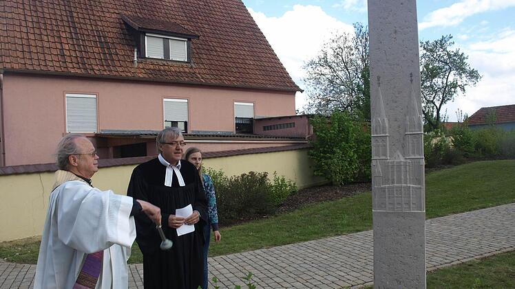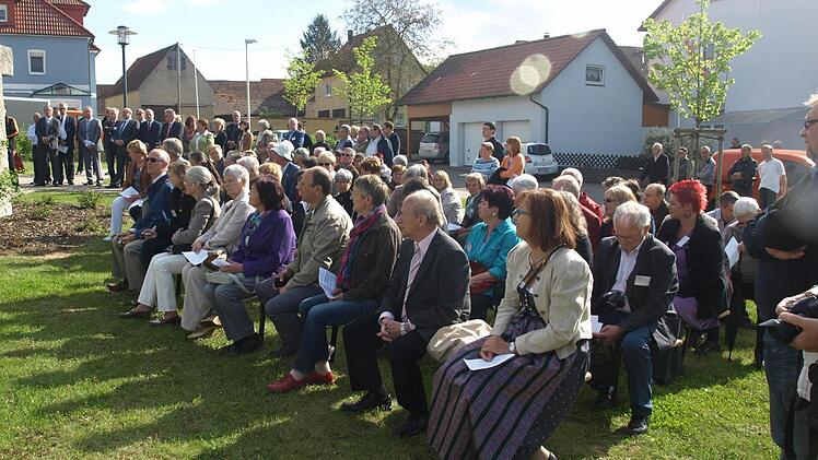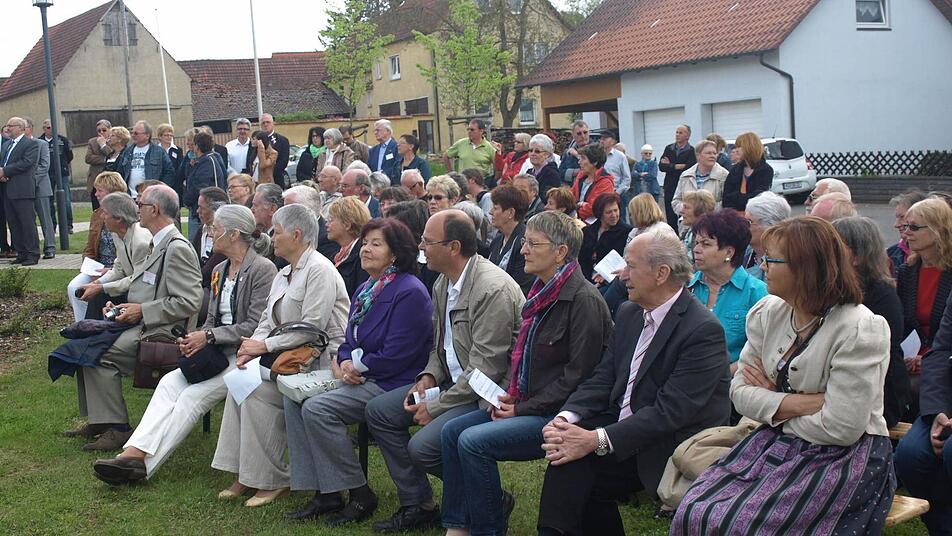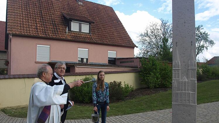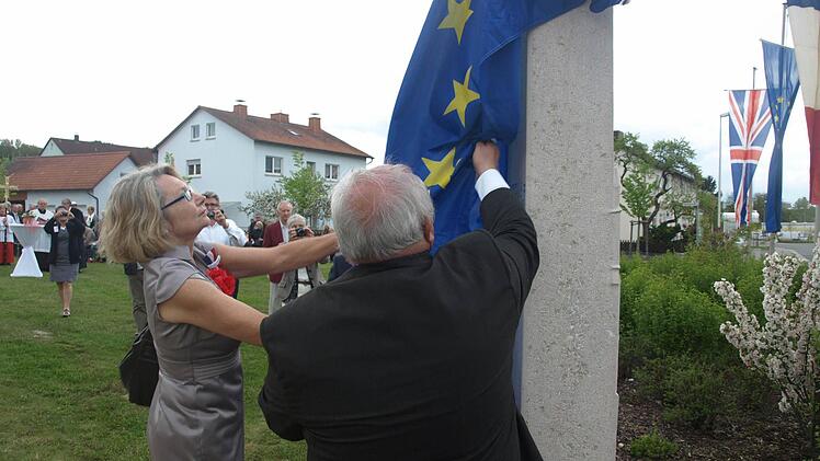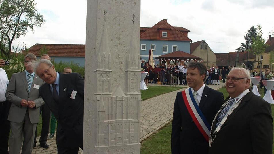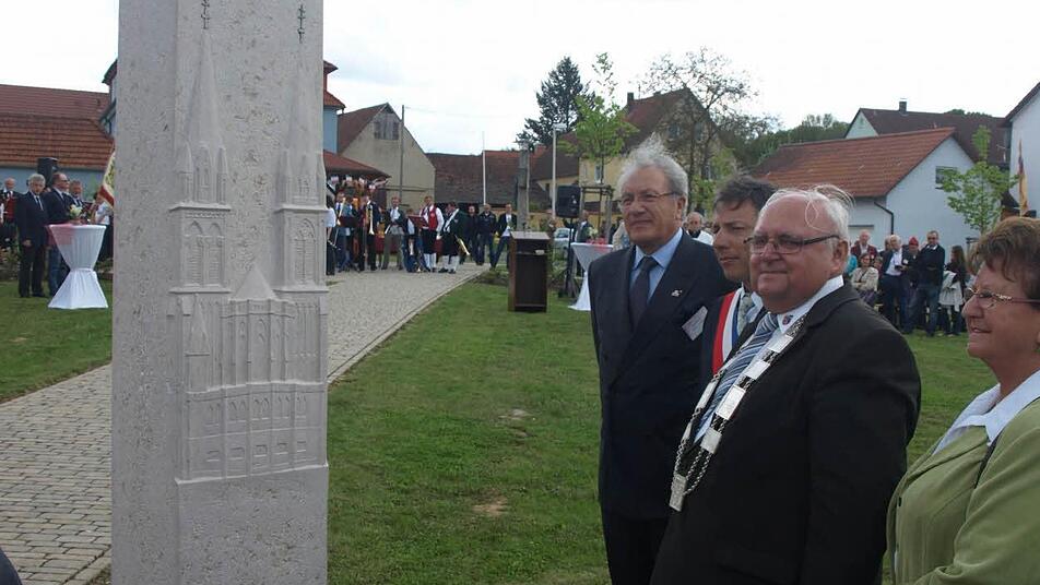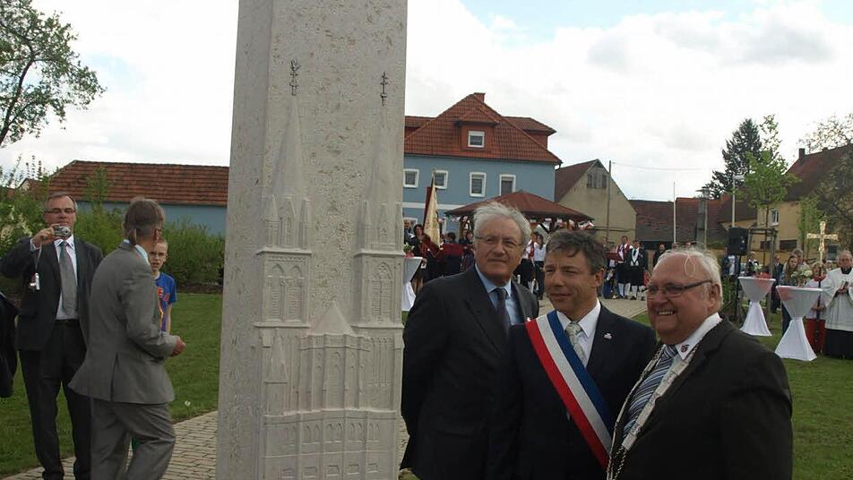 Schließlich enthüllten die Bürgermeister und Komiteevorsitzenden den Gedenkstein. Die Stele in der Art der fränkischen Bildstöcke schuf Bildhauermeister Thomas Kessler (Stangenroth). Auf dem Sockel aus fränkischem Muschelkalk steht eine drei Meter hohe Säule aus französischem Kalkstein, der wetter- und frostsicher ist.