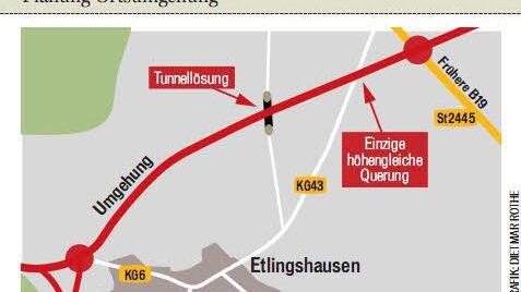 Die Umgehung ist nicht einfach nur eine neue Straße: Weit mehr als 100 000 Kubikmeter Erde würden laut aktueller Planung bewegt - an einer Stelle soll die Straße sieben Meter tief eingegraben werden, 200 Meter weiter würde sie auf einem neun Meter hohen Erdwall verlaufen. Immerhin haben die Landwirte bereits eine Tunnelröhre für diesen Wall ausgehandelt.