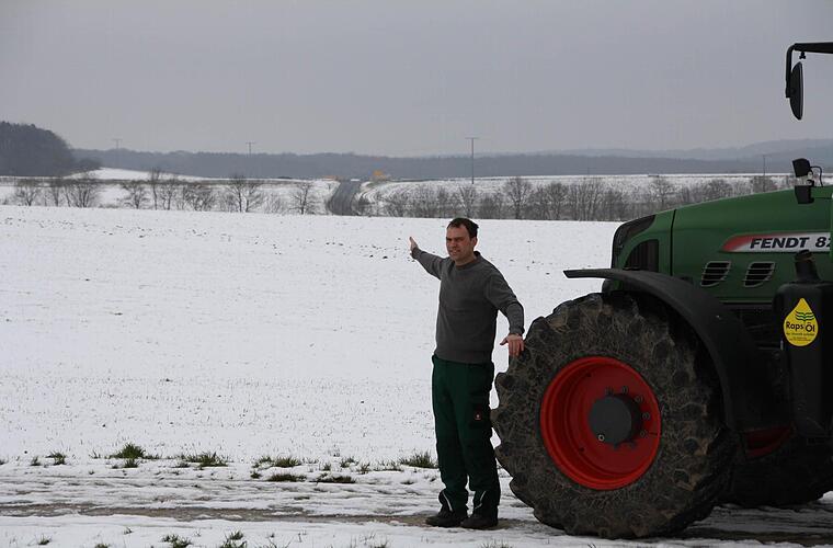 Der Kreistag hat der Verlegung der Kreisstraße KG 43 zugestimmt, aber weil Grundstückseigentümer sich sperren, kann frühestens Mitte 2015 gebaut werden. Landwirt Stefan Karch sitzt zwischen den Stühlen.