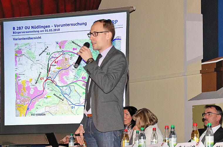 Diplom-Ingenieur Robert Männling vom Planungsbüro SRP stellte sehr ausführlich die Varianten vor. Die Nordvariante läuft zwischen Nüdlingen und Haard und wurde in mehreren verschiedenen Versionen geplant. Die am nördlichsten verlaufende Version erfordert eine 800 Meter lange Brücke. Alle Nord-Versionen beginnen westlich von Nüdlingen an der jetzigen B287 und münden östlich wieder in sie ein. Auch alle Süd-Varianten beginnen westlich von Nüdlingen. Drei Varianten führen dann zurück auf die B287, weitere drei samt mehrerer Unter-Varianten münden jedoch in unterschiedlicher Höhe in die Staatsstraße St2445 am "langen