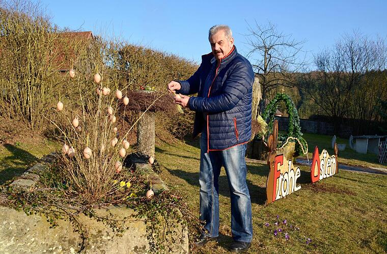 aus Heu in Tracht, das jedoch ausgedient hatte. "Deshalb haben wir uns etwas Neues einfallen lassen müssen", erklärt Egon Kessler. Der Ortsreferent platzierte eine frisch bepflanzte Blumenschale in einem großen Nest. Dieses ist ebenso wie ein zweites, die Hasen aus Baumscheiben und der große Schriftzug "Frohe Ostern" neu, angefertigt von Kessler und seinen Mitstreitern vom Arbeiter- und Heimatverein.
