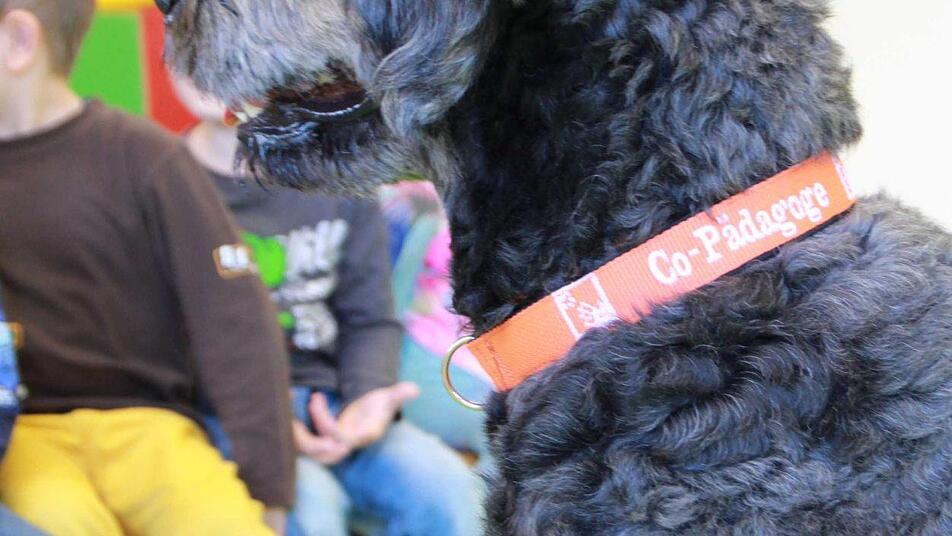 Graue Haare, kalte Schnauze, Festanstellung seit eineinhalb Jahren. Sein Arbeitsplatz: der Maria-Stern-Kindergarten in Hausen. "Co-Pädagoge" steht auf dem orangefarbenem Halsband. Kindergarten-Hund "Benschj" hat gerade Dienst im Turnraum. Eines der Vorschulkinder schleudert das schwarze Täschchen über die Gummimatten. Der Golden-Doodle flitzt hinterher, schnappt sich den Beutel, trabt zurück und legt ihn vor Emilian ab. Kommando "Platz", Leckerli, kraulen, weiter zum nächsten. Acht Kinder lernen während der "Benschj"-Stunde, dass ein Hund für mehr steht als die formelhafte Warnung "Achtung, der beißt!". Die vierbeinigen Vermittler werden nicht nur als Pädagogen eingesetzt.
