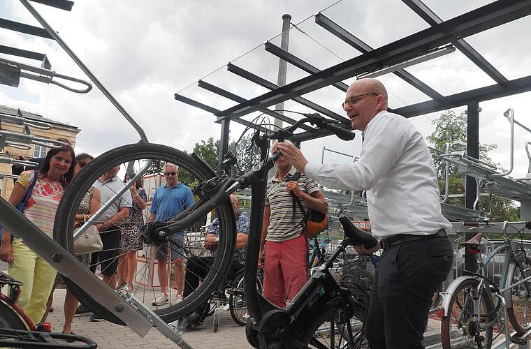 Oberbürgermeister Dirk Vogel gibt die Fahrradparkanlage am Bahnhof zur Nutzung frei. Die Stadt wird fahrradfreundlicher. In den vergangenen zwei Jahren hat Bad Kissingen auf gut 3600 Metern die Möglichkeiten zum Fahrradfahren verbessert, etwa mit Schutzstreifen in der Erhard- und Salinenstraße oder durch die Befahrbarkeit der Fußgängerzone während der Lieferzeiten.